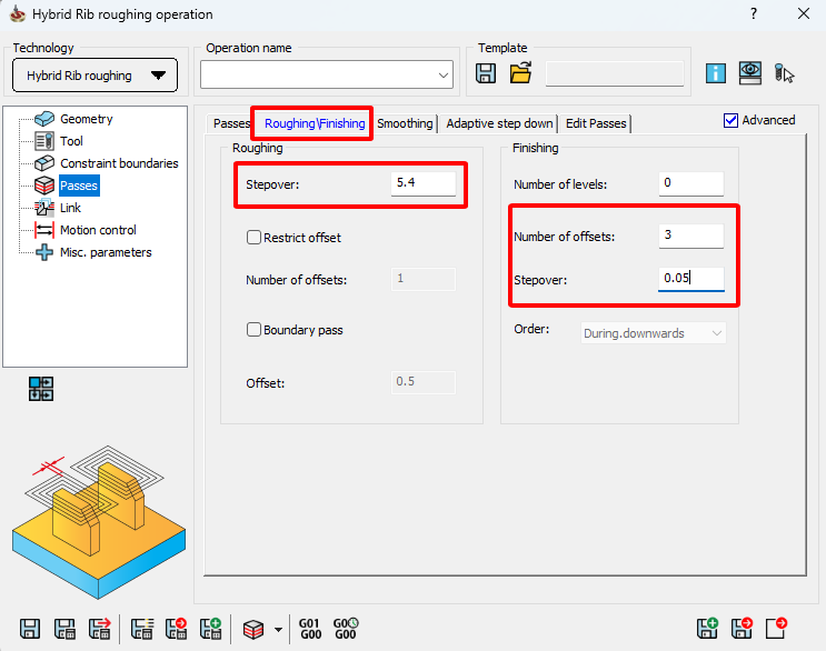 Chiến lược chính ở đây là phần mềm chia ra cho chúng ta lựa chọn vừa có thể gia công cắt thô và có thể cắt tinh luôn trong cùng một lần cắt, ngoài ra chúng ta có thể lựa chọn tùy ý mong muốn bao nhiêu lát cắt tinh cuối thì chúng ta có thể thêm giá trị trong phần (Number ò offset).