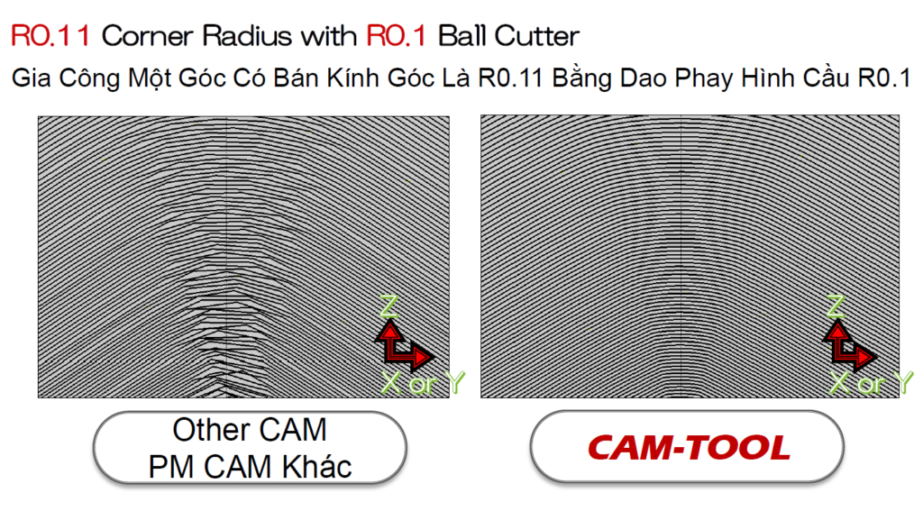 So sánh giữa 2 phần mềm CAM cùng xử lý đường chạy dao gia công một góc bán kính R0.11 bằng dao phay hình cầu R0.1.