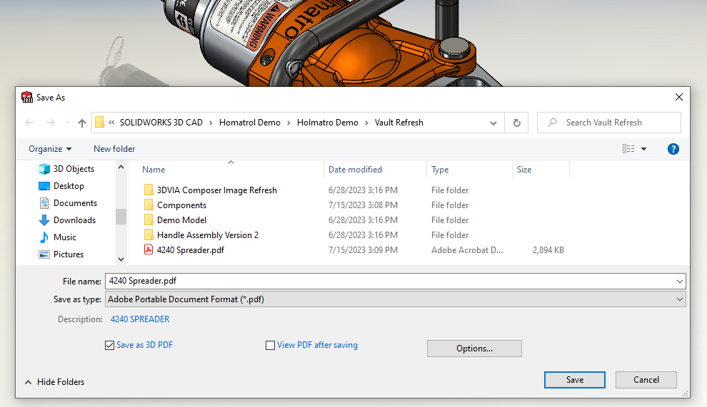Thật may mắn rằng, SOLIDWORKS có khả năng lưu trữ tệp PDF dạng 3D. Người dùng có thể lưu tệp tin bao gồm chi tiết đơn hoặc bản lắp ráp dưới định dạng 3D PDF mà không cần sử dụng ứng dụng đọc tệp tin chuyên dụng nào.
