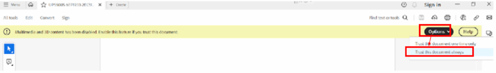 Để thiết lập hiển thị 3D PDF, nhấp chọn vào mục Options > Trust this document always