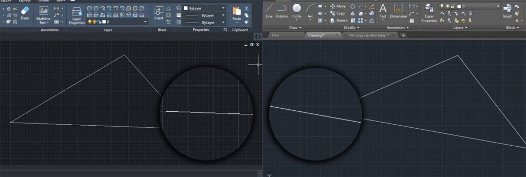Khi sử dụng hệ thống máy tính dùng card đồ họa chuyên dụng Quadro P4000 sẽ đánh giá được sự chênh lệch giữa ZWCAD và AutoCAD. Có thể thấy việc tối ưu và tương thích với phần cứng của ZWCAD chưa thực sự tốt khi nét vẽ bị răng cưa và đứt gãy so với AutoCAD.